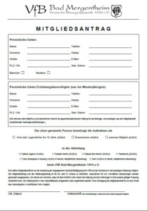 Du möchtest Mitglied beim VfB Bad Mergentheim 1910 e.V. werden? Sportlich als aktives Mitglied oder Unterstützend als passives Mitglied? Nichts leichter als das. Hier findest du das Formular für den Mitgliedsantrag. Einfach PDF ausdrucken, ausfüllen und anschließend nur noch unterschreiben und abgeben.